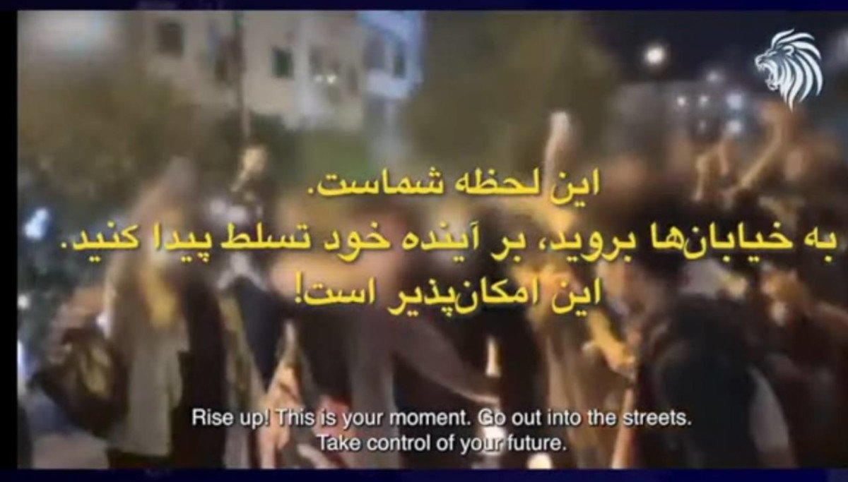 הוא סיים את פנייתו בסיסמה שאומצה במחאות האזרחיות באיראן בשנים האחרונות: "אישה, חיים, חירות". הוא שב ואמר: "המאבק שלנו הוא נגד משטר רודני שמדכא אתכם ומותיר אתכם בעוני, לא נגדכם. עם ישראל והעם הפרסי היו ידידים מאז ימי כורש הגדול – הגיע הזמן שתתאחדו סביב מורשתכם ותובילו שינוי".
