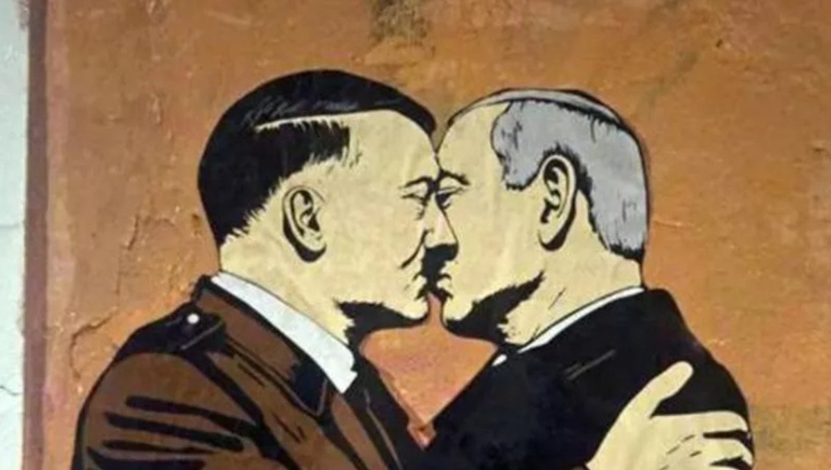 גרפיטי שבו נראה ראש הממשלה בנימין נתניהו מתנשק עם אדולף היטלר בלילה שבין יום ראשון ליום שני השבוע (25-26.5), מול בית ספר התיכון מנרה שבדרך בסיליו בריצ'י שבעיר רומא.