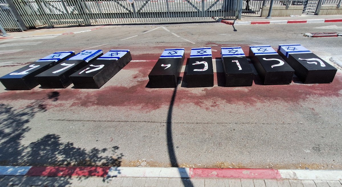 בשיאו של חום יולי-אוגוסט, תחת השמש הקופחת יושבת קבוצת לוחמי צה"ל, בני דורות שונים, הלומי קרב, שמנהלים עכשיו קרב נוסף – על איכות חייהם, וגם על זו של אחרים במצבם. מול מטה אגף השיקום של משרד הביטחון ברחוב ז'בוטינסקי בפתח תקווה הם הקימו מיצג דומם ומקפיא דם: שורת ארונות קבורה, עטופים בדגלי ישראל, כל אחד מהם מוכתם בטיפת דם. יחד הארונות מרכיבים את המילים "הלומי קרב" ומבטאים את מחאתם נגד המערכת.