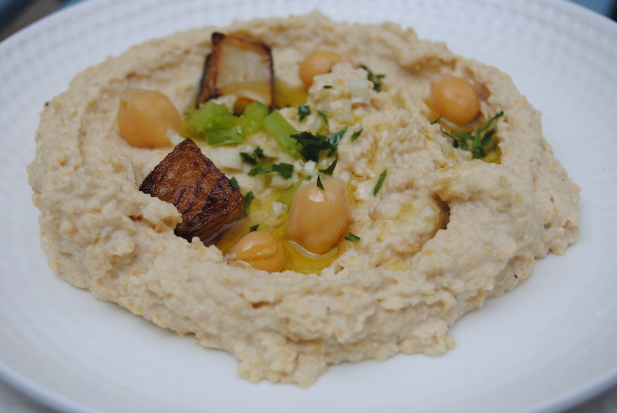 ממרח חומוס עם קוביות חציל בתיבול פיקנטי