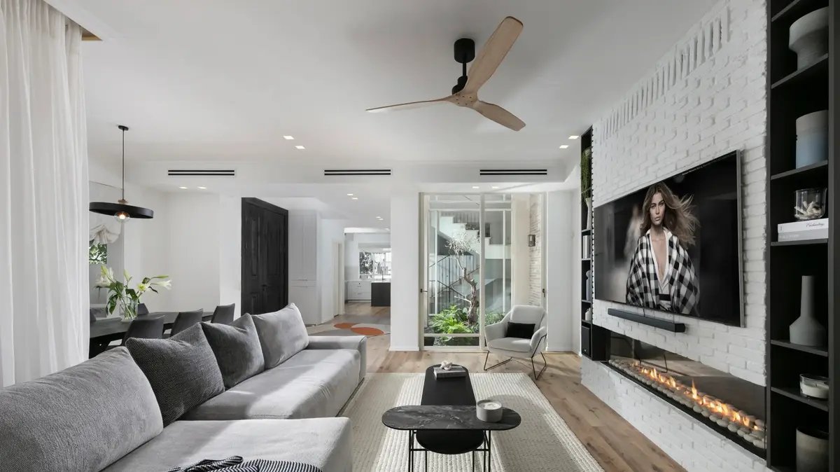 המטבח עבר שדרוג מלא – שילוב של ויטרינה שחורה אלגנטית עם נגרות כפרית מעודנת, אי במרכז עם קווים רכים ופונקציונליות מדויקת, ותחליף לאריחים: פרקט עץ שמעניק חמימות ורצף עיצובי. קיר הקמין שנבנה בעברו מבריקים קלאסיים נצבע בגוון לבן – כך עודנה תחושת הכפריות, ונוצר איזון מחודש בין ישן לחדש. גם המעקה, שהיווה אלמנט בולט בבית, נצבע בגוון כהה ומוקפד, כחלק משפה עיצובית שזורמת לכל אורך הבית.