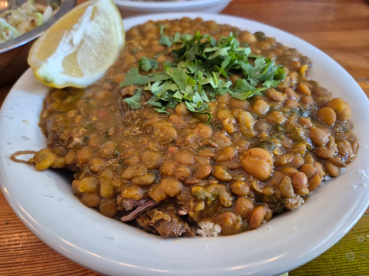 מה זה "נגישים"? 65 שקלים למנה משביעה עם בשר: אנחנו הלכנו על חרירה עם בשר, תבשיל חומוס, עדשים ובשר בבישול איטי (יש כזה גם צמחוני) שהוגש (לבקשתנו) עם קוסקוס ו"הקציצות של נאווה", קציצות בבקר, אפונה ועגבניות שהוגשו, לבחירתנו על אורז לבן. שני התבשילים התגלו כמאוד טעימים וסלט כרוב עם כוסברה וג'עלה (מנה גדולה 26 שקלים, מנה קטנה – 16), די סגר לנו את הפינה.