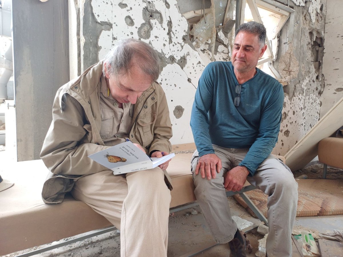 הסופר מישל וולבק בביקור בבארי יחד עם רוני ברוך שבנו עידן ז"ל נרצח בטבח ובנו סהר ז"ל נחטף ונרצח בשבי (צילום: דוברות בארי)