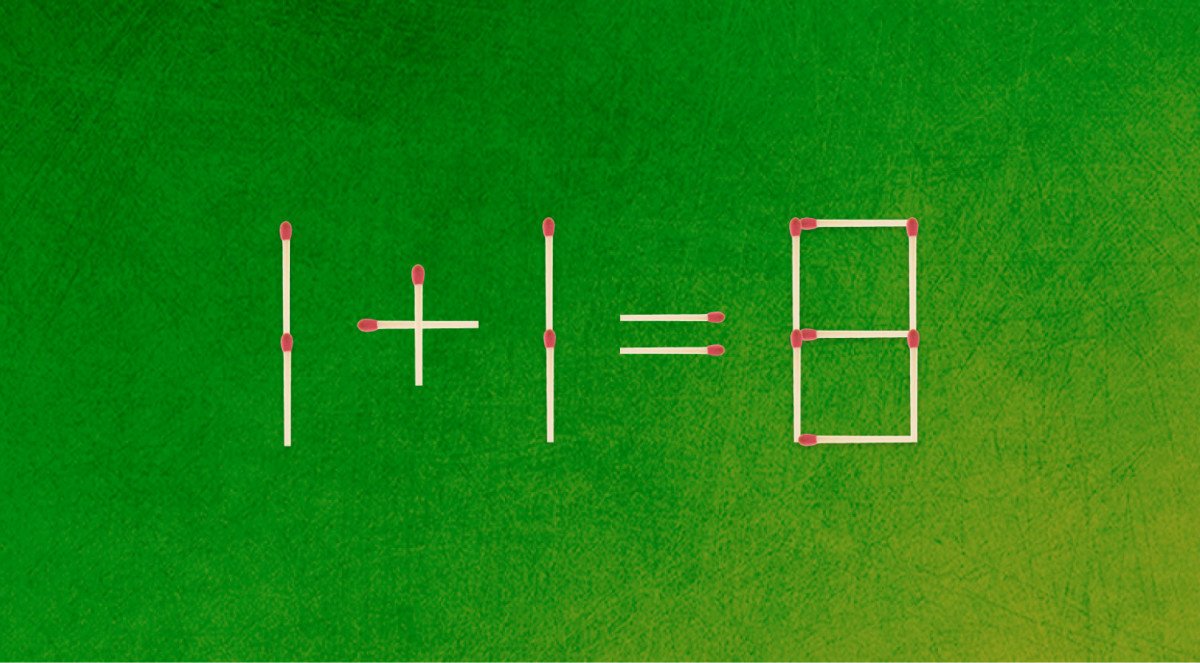 לפניכם תרגיל שגוי, 1+1=8, המורכבת מ-15 גפרורים. עליכם להזיז גפרור אחד, כדי לשנות את המשוואה ולהגיע לפתרון ההגיוני. התשובה בתחתית הכתבה.