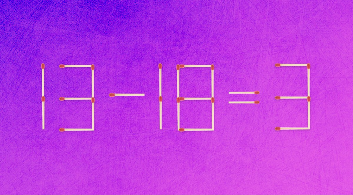 לפניכם תרגיל שגוי, 13-18=3, המורכבת מ-24 גפרורים. עליכם להזיז גפרור אחד, כדי לשנות את המשוואה ולהגיע לפתרון ההגיוני. התשובה בתחתית הכתבה.