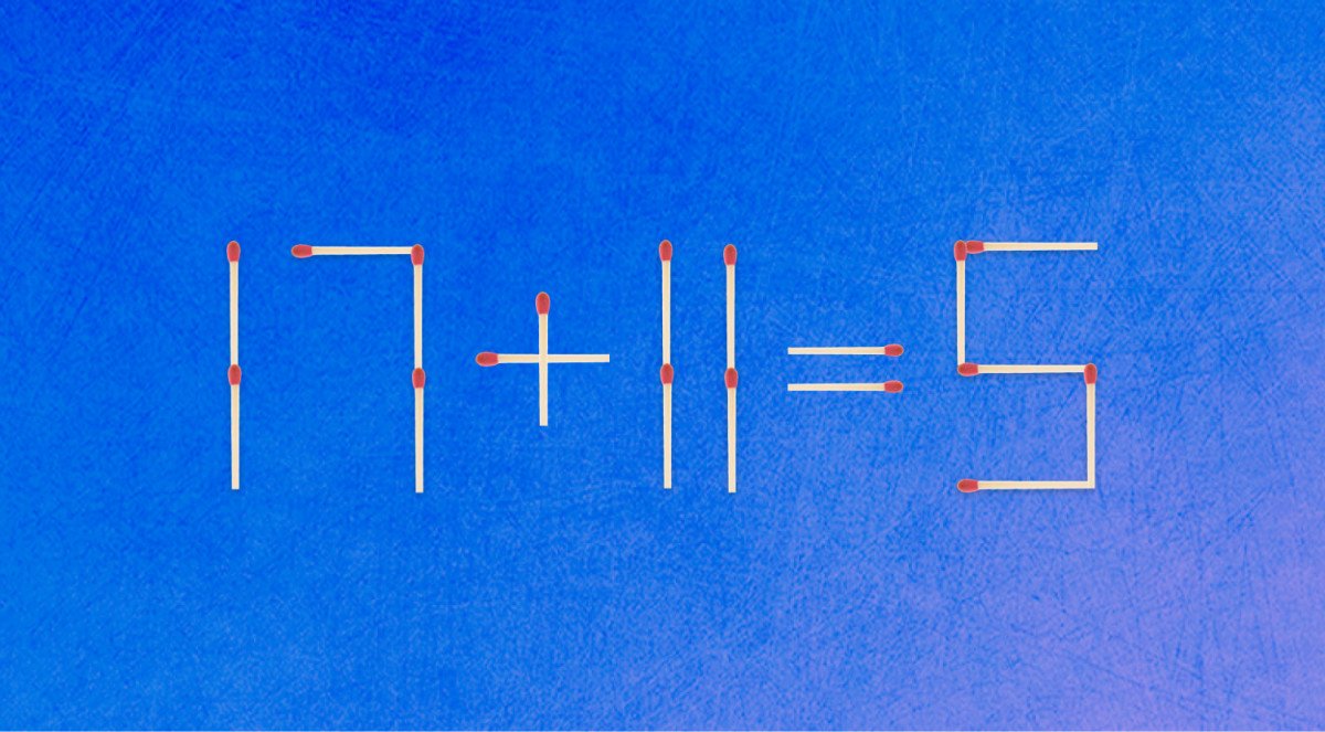 לפניכם תרגיל שגוי, 17+11=5, המורכבת מ-18 גפרורים. עליכם להזיז גפרור אחד, כדי לשנות את המשוואה ולהגיע לפתרון ההגיוני. התשובה בתחתית הכתבה.