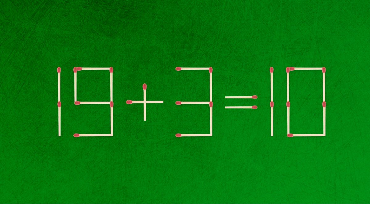 לפניכם תרגיל שגוי, 19+3=10, המורכבת מ-25 גפרורים. עליכם להזיז גפרור אחד, כדי לשנות את המשוואה ולהגיע לפתרון ההגיוני. התשובה בתחתית הכתבה.