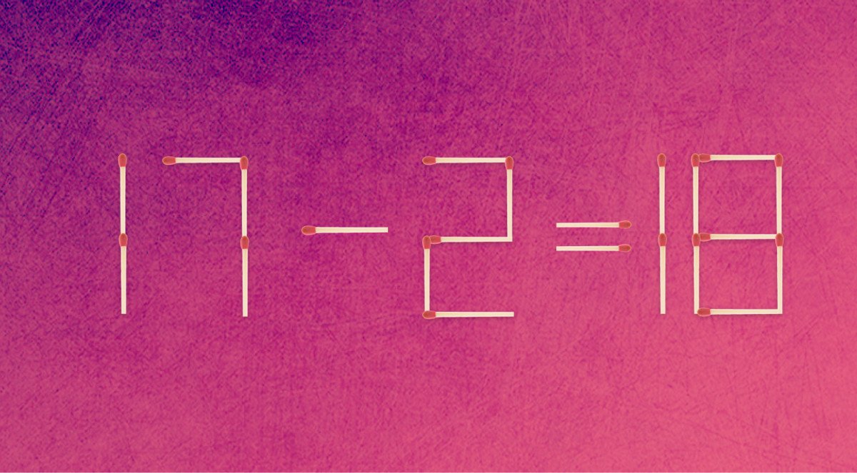 לפניכם תרגיל שגוי, 17-2=18, המורכבת מ-22 גפרורים. עליכם להזיז גפרור אחד, כדי לשנות את המשוואה ולהגיע לפתרון ההגיוני. התשובה בתחתית הכתבה.