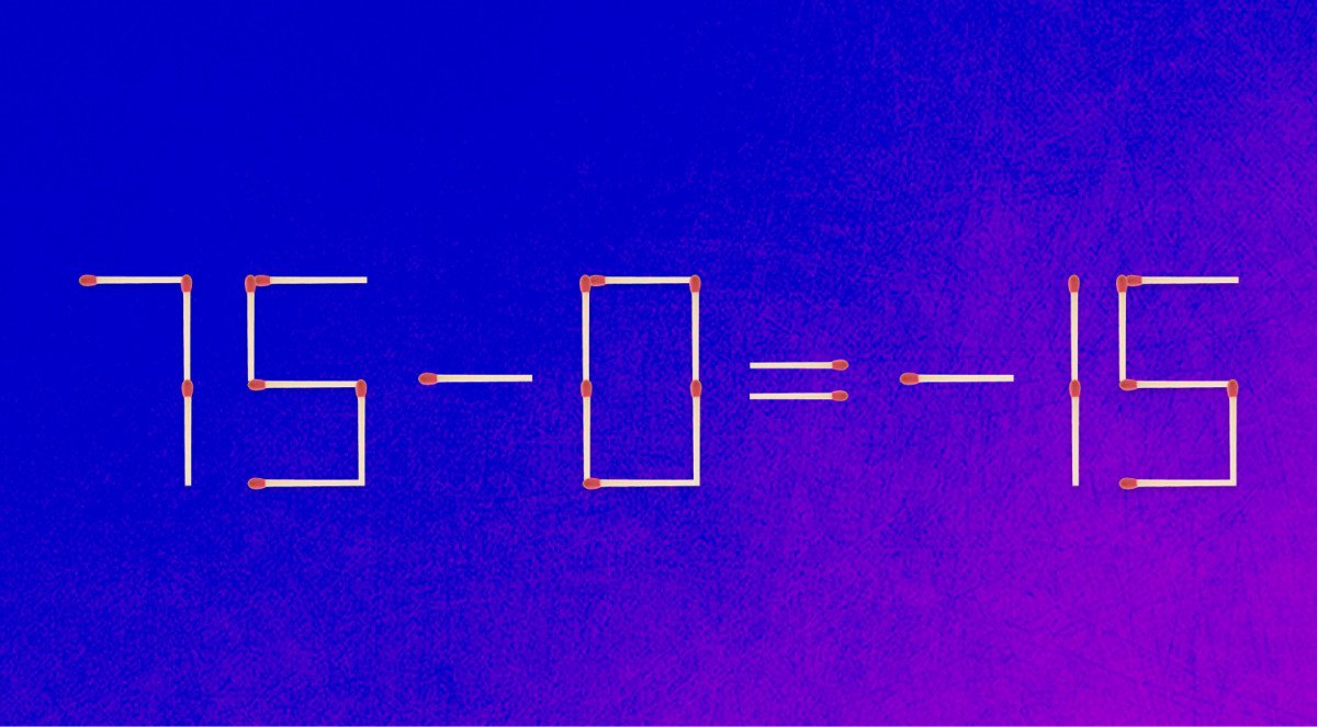 לפניכם תרגיל שגוי, 75-0=-15, המורכב מ-26 גפרורים. עליכם להזיז גפרור אחד, כדי לשנות את המשוואה ולהגיע לפתרון ההגיוני. התשובה בתחתית הכתבה.