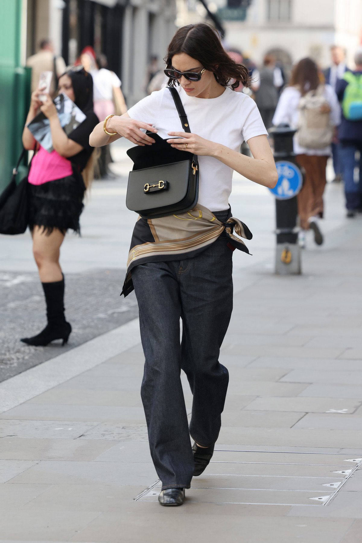 מה שמעניין זה שיש שתי גרסאות לטרנד הזה – אחת נועזת יותר ואחת שמרנית יותר. קלואי סביני בחרה בגרסה שמראה הרבה רגליים, אבל יש גם דרך להתאים את זה לסטייל יותר מאופק. אלכסה צ'אנג הוכיחה את זה כשהיא טיילה ברחובות לונדון עם טי שירט לבן פשוט ומכנסיים אפורים עסקיים, ומה שהפך את הלוק מרגיל למיוחד היה הצעיף החום של גוצ'י שהיא קשרה מעל המכנסיים. פתאום הלוק הבסיסי הפך לסטייל סטייטמנט.