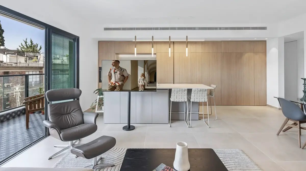 המטבח בנוי במבנה מקבילי: מצד אחד קיר ארונות גבוהים, ומנגד אי רחב הכולל כיור ופינת ישיבה. המבנה הזה מחזק את תחושת הזרימה בחלל, תורם לשמירה על סדר ומאפשר שגרת שימוש נוחה ויעילה – שילוב של דיוק עיצובי עם פתרונות טכנולוגיים מותאמים אישית.