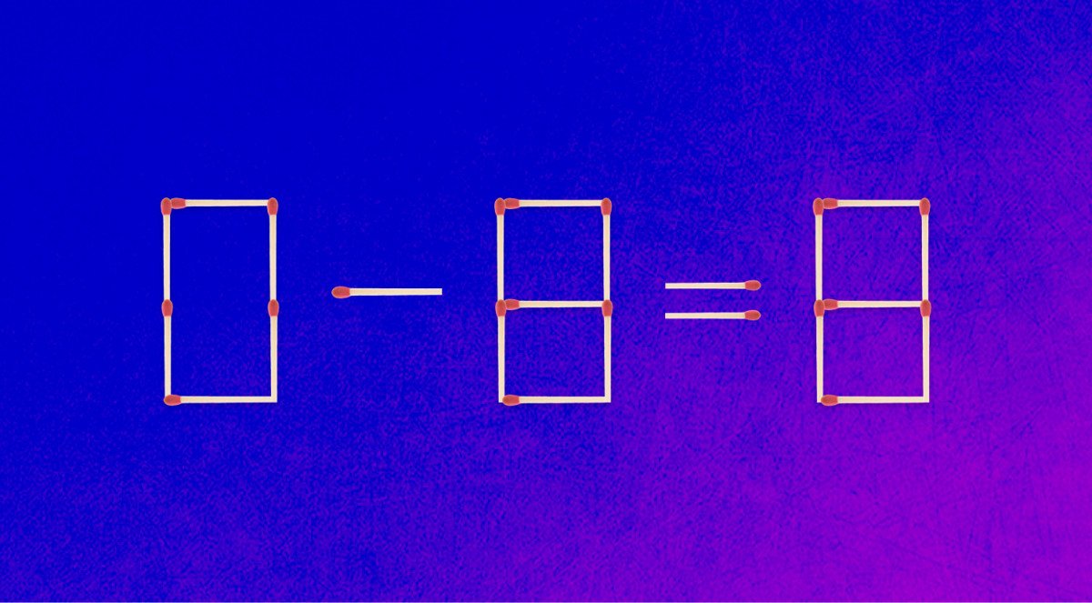 לפניכם תרגיל שגוי, 0-8=8, המורכב מ-23 גפרורים. עליכם להזיז גפרור אחד, כדי לשנות את המשוואה ולהגיע לפתרון ההגיוני. התשובה בתחתית הכתבה.