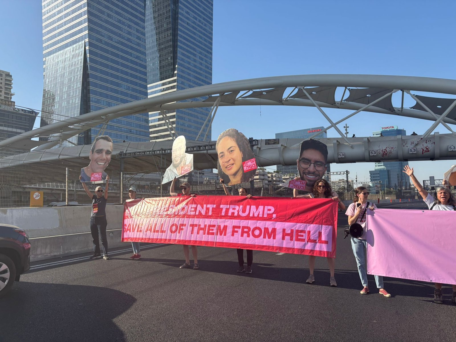 איילון דרום נחסם לתנועה סמוך לגשר יהודית על ידי משפחות חטופים ופעילות מחאת הנשים להחזרת החטופות והחטופים.