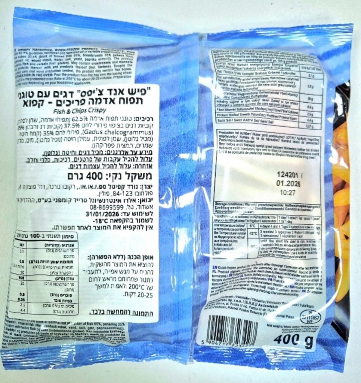שם המוצר: "פיש אנד צ'יפס" דגים עם טוגני תפוח אדמה פריכים – קפוא