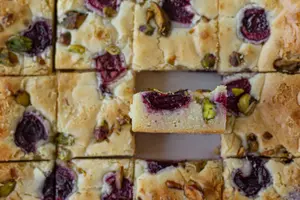 מהרגע שעליתי על המתכון הזה, אני לא מפסיק להכין אותו. פעם עם פטל, פעם עם שוקולד לבן מקורמל, ואפילו עם שברי עוגיות הם יוצאים נהדר (אבל אז מומלץ להגדיל קצת את כמות המלח). בגרסה הזאת, הדובדבנים והלימון מוסיפים חמיצות שמאזנת את המתיקות, והפיסטוקים מוסיפים קראנצ'יות כיפית.