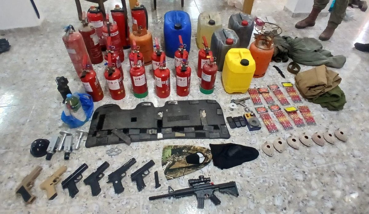 במהלך החיפוש איתרו הכוחות מטען חבלה מוכן, בקבוק תבערה, 17 מטפי כיבוי, חמישה מיכלי דלק, שני בלוני גז עם גזיות, שמונה חבילות זיקוקים, חגורת נפץ ריקה, ציוד צבאי הכולל מעילים, תיקים, חגורה וכיסויי פנים, סכין, מצלמות, פלאפונים, רובה 'איירסופט' ושישה אקדחי 'איירסופט' עם מחסנית. בנוסף, נתפסו כספים החשודים ככספי טרור: 27,330 ש"ח ו-30,500 פורינט (מטבע הונגרי).