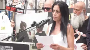 "ב-7.10 נחטפה כל המשפחה שלי, אני, בעלי דוד, ושתי בנותינו אמה ויולי, אז בנות 3 בלבד", פתחה את נאומה שרון, אשתו של דוד קוניו החטוף בעזה. "דוד בעלי, אהבת חיי, והאבא של הבנות שלי, עדיין שם. התאומות ואני חזרנו ביום החמישים ושתיים. אמה ויולי שלנו חגגו חמש, בלי אבא שלהן. בשבוע הבא הן ילכו לגן חובה, והן יודעות שאבא לא יהיה איתן ביום הזה. הן יודעות שאבא שלהן שם. לפני כמה ימים, כשהשכבתי אותן לישון הן שאלו אותי 'אמא, את בטוחה שאבא יחזור?'".