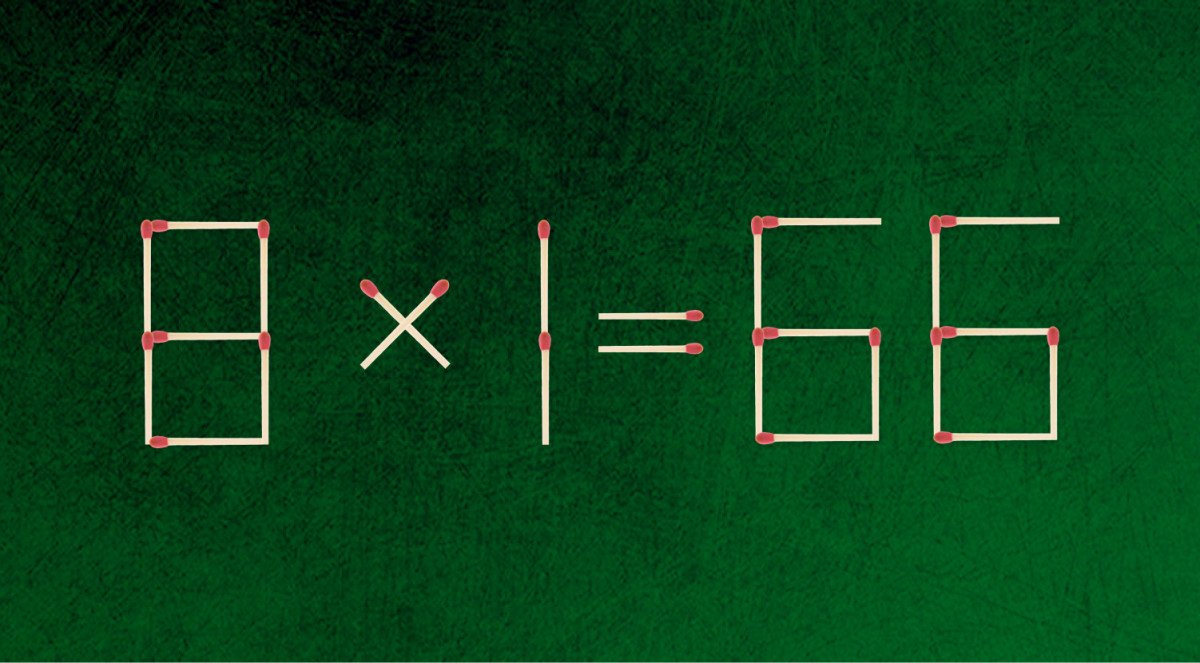 לפניכם תרגיל שגוי, 8×1=66, המורכבת מ-25 גפרורים. עליכם להזיז גפרור אחד, כדי לשנות את המשוואה ולהגיע לפתרון ההגיוני. התשובה בתחתית הכתבה.