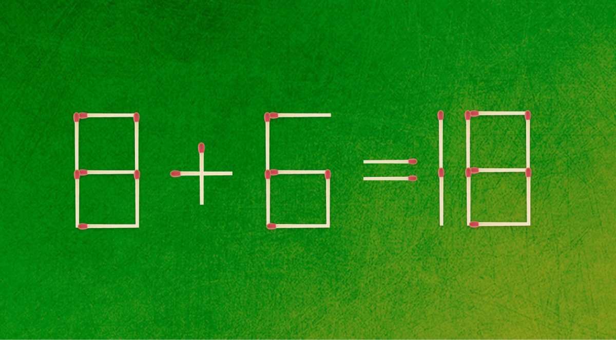 לפניכם תרגיל שגוי, 8+6=18, המורכב מ-26 גפרורים. עליכם להזיז גפרור אחד, כדי לשנות את המשוואה ולהגיע לפתרון ההגיוני. התשובה בתחתית הכתבה.