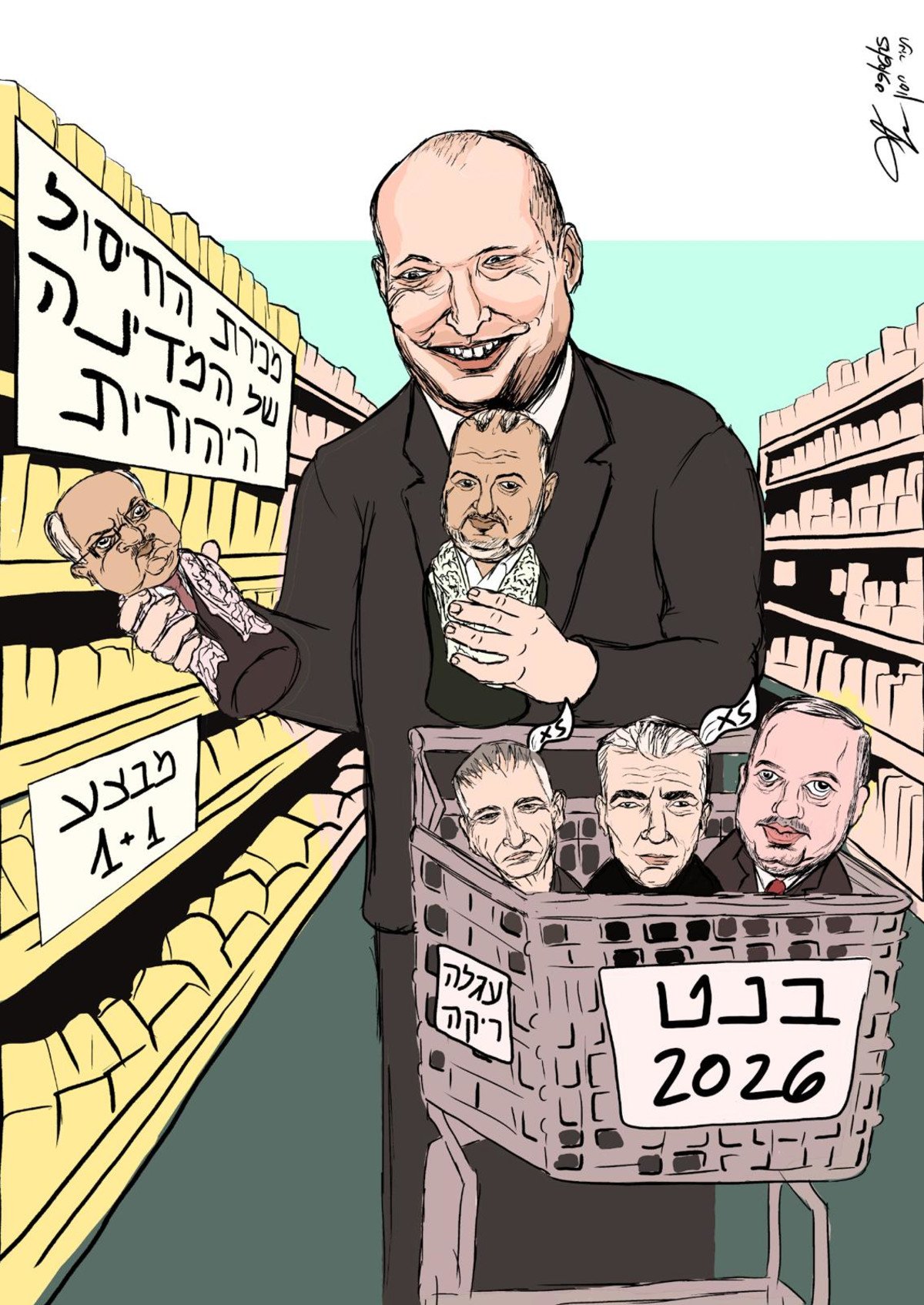 בקריקטורה, נראה בנט גורר עגלה שעליה כתוב "עגלה ריקה" – כינוי גנאי שניתן לחילונים על ידי החזון איש, כשהוא מכניס אליה את ראשי הרשימות אביגדור ליברמן ("ישראל ביתנו"), יאיר לפיד ("יש עתיד"), יאיר גולן ("הדמוקרטים"), וכשהוא אוחז באחמד טיבי (ח"כ מטעם תע"ל) ובמנסור עבאס ("רע"מ"). על המדפים נכתב: "מכירת חיסול של המדינה היהודית – מבצע 1+1". בתמונה, יש לציין, לא מופיע בני גנץ ("המחנה הממלכתי").