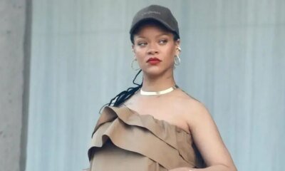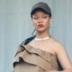 ריהאנה לבשה שמלת סטרפלס חומה בגזרה משוחררת מעוטרת ראפלס, בעיצוב מותג-העל הצרפתי סן לורן. היא איבזרה את הלוק עם כובע מצחייה מבית אותו מותג, סניקרס חומות...