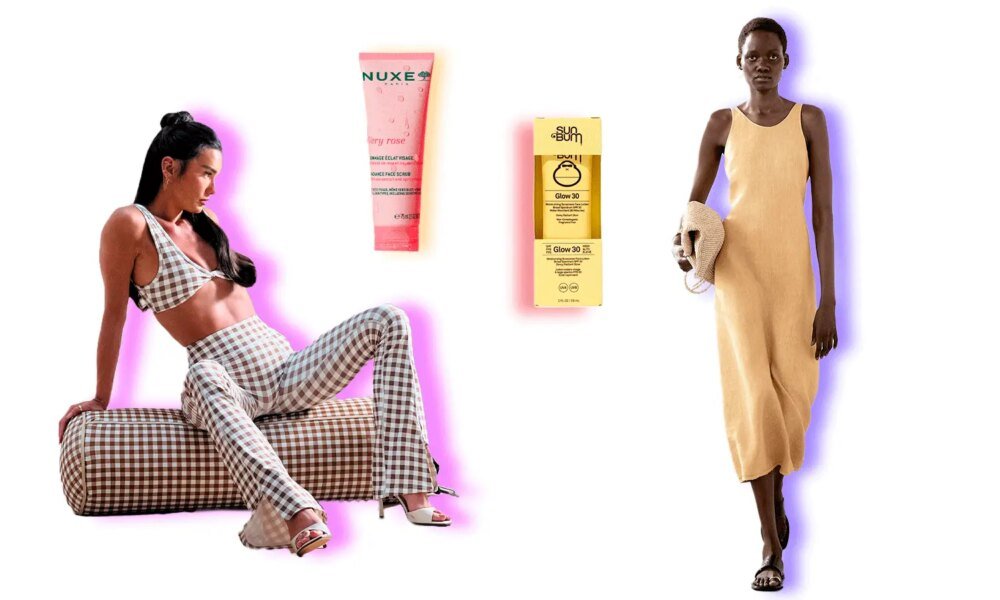 שמלת פשתן בגוון הממכר של חמאה רכה וצהבהבה, מוצרי פנים שירככו את העור בתמציות מי ורדים, קלאץ' תכול וסרוג שירענן כל לוק בחודשי הקיץ החמים, סט...