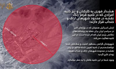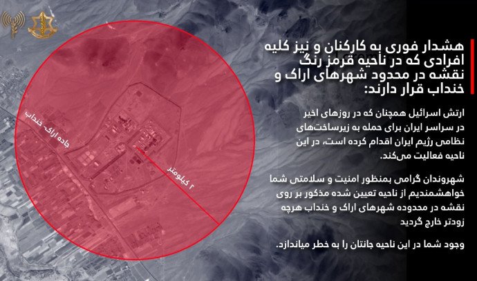 דובר צה"ל בפרסית פרסם לפני זמן קצר הודעת אזהרה דחופה לאזרחים באיראן. "אזהרה דחופה לעובדים ולכל האנשים שנמצאים באזור האדום של המפה בגבולות הערים ערק וחנדב....