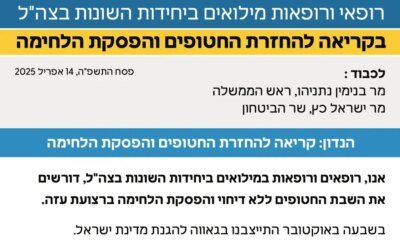 כ-200 רופאים ורופאות בשירות מילואים פרסמו הערב (ראשון) מכתב הקורא להפסקת הלחימה בעזה. לצדם, מאות יוצאי מוסד חתמו על מכתב דומה. "אנו, רופאים ורופאות במילואים ביחידות...