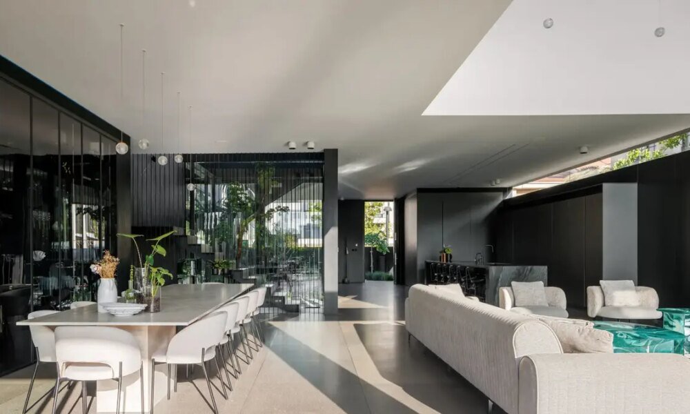 הבית בנוי בשלושה מפלסים ומאופיין בקווים גיאומטריים נוקשים, קירות מחופים באבן טבעית עם טקסטורה תלת-ממדית בגוני גרפיט ושחור, וריצוף כהה שמוסיף עומק ותחושת דרמה. במרכזו פטיו...