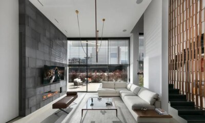 משמאל נפתח חלל הסלון בתקרה כפולה, המעניקה תחושת מרחב ואלגנטיות. זהו חלל האירוח המרכזי, הכולל קיר אריחי בטון מיוחדים, ומשולבות בו מערכות שונות כגון מיזוג אוויר...