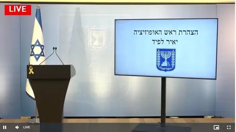 ראש האופוזיציה יאיר לפיד בהצהרה לתקשורת: "שבועיים לפני מחדל השבעה באוקטובר עשיתי מסיבת עתונאים ובה הזהרתי שאנחנו בדרך למלחמה ולאסון בטחוני. הממשלה סירבה להקשיב. אני רוצה...