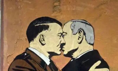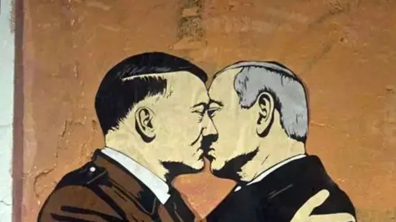 אמנית רחוב באיטליה ציירה על קיר בלב הבירה רומא ציור קיר של ראש הממשלה בנימין נתניהו מתנקש עם מנהיג גרמניה הנאצית אדולף היטלר, במחאה על המלחמה...
